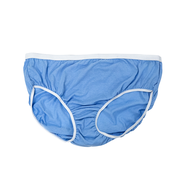 Women’s blue bikini brief, 95/5 cotton/spandex jersey. Featuring double crotch, elastic waist, and leg opening.
