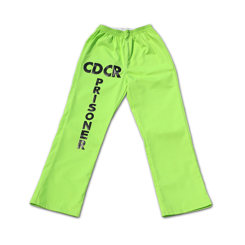 The Jail Uniform Slip-On Trousers have an elastic waist band. Mens style - Mock fly. Womens style - Silk-screened "CDCR Prisoner".