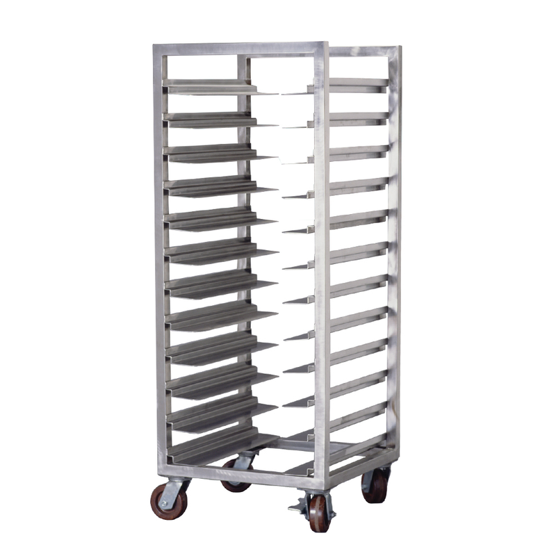 The Roll-in Refrigerator Rack is a multipurpose food rack that is designed to hold 12 trays and can be used in both the refrigerator or in a warming oven. Units feature all welded construction of 14 gauge sheet and 16 gauge square stainless steel tube. Will accommodate 12" x 20" x 2-1/2" deep pans produced by Vollrath, USECO, SECO and Polar.