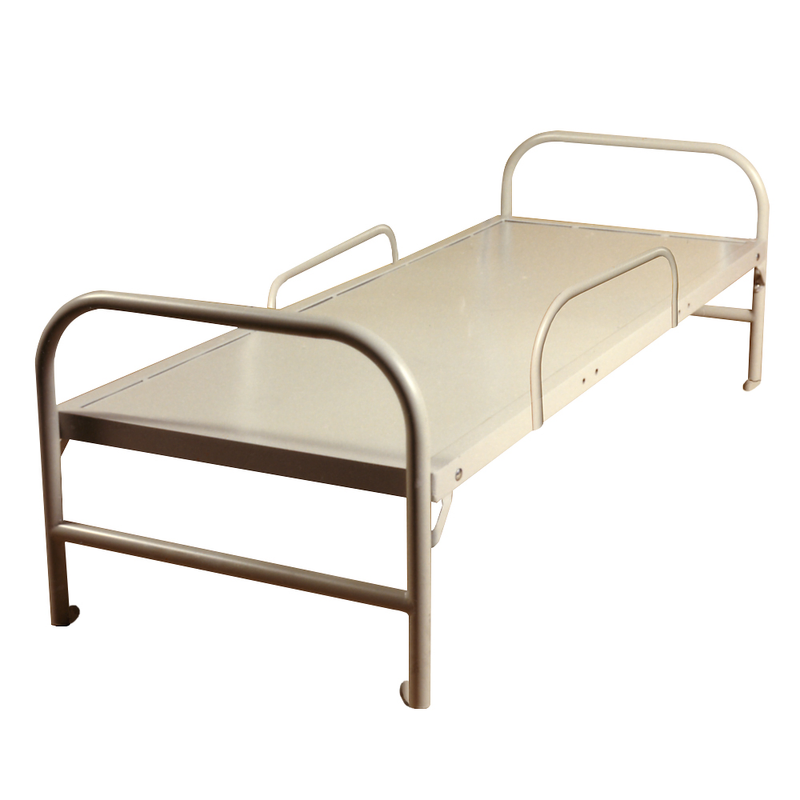 The Security Dorm Bed is shown with optional safety rails (Item # 761300). Constructed of 1 1/2" round tubular steel head and foot frames. Dropped tubular spreaders with all joints welded. Two 10 gauge stainless steel foot mounting lugs for floor attachment (hardware not included). 10 gauge pan is single sheet construction with all sides formed 2" down with a 1" hem.