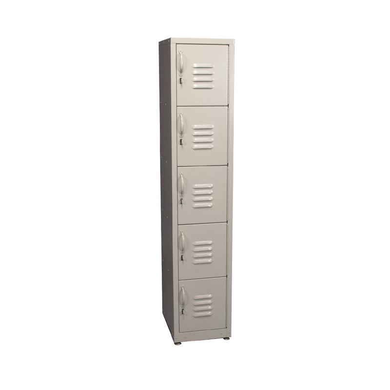 The Tiered Locker has a handle and hasp for a padlock (lock not included). Louvered doors. Body and shelf are constructed of 20 gauge steel. Four 10 gauge foot brackets (mounting hardware not included) and four 1" rubber cushion leveling glides.